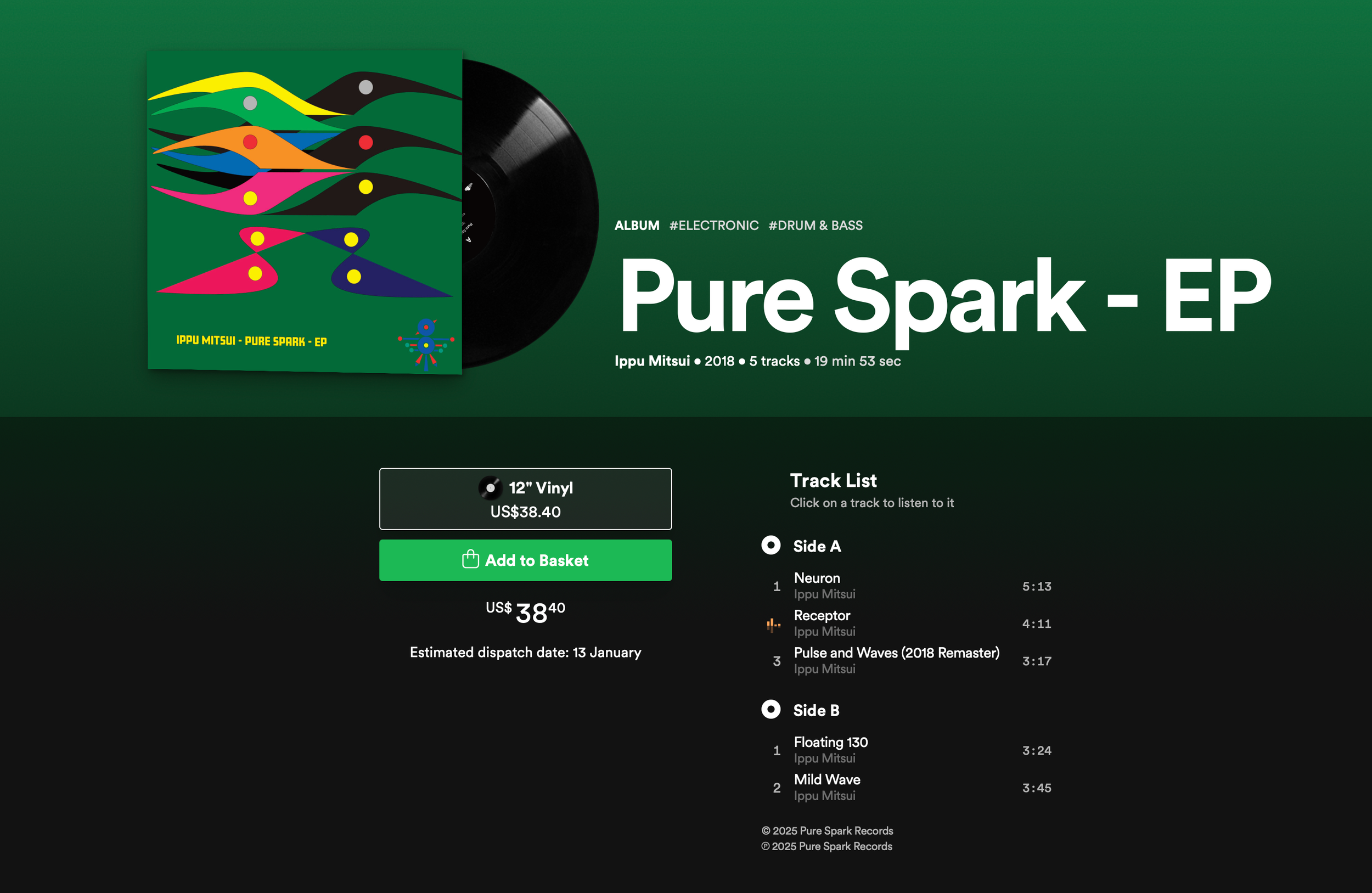 For one of our latest digital releases, ‘Flowers (2025 Remaster)’ by Senji Niban, you can Pre-rder a ’12’ vinyl on Diggers Factory’s website. And for ‘Pure Spark’ (EP) by Ippu Mitsui, you can find a ’12’ vinyl on elasticStage’s website, and it’s made by SoundCloud! We’re incredibly grateful and very appreciative of all the companies and artists who helped make these vinyl projects possible.